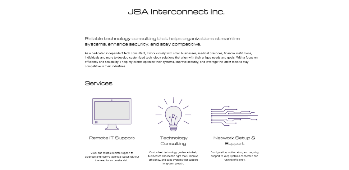 JSA Interconnect Inc. needed a professional logo and website to establish a clear and credible online presence. The goal was to create a clean, easy-to-navigate site that communicates services effectively and reflects the company’s reliability and expertise.